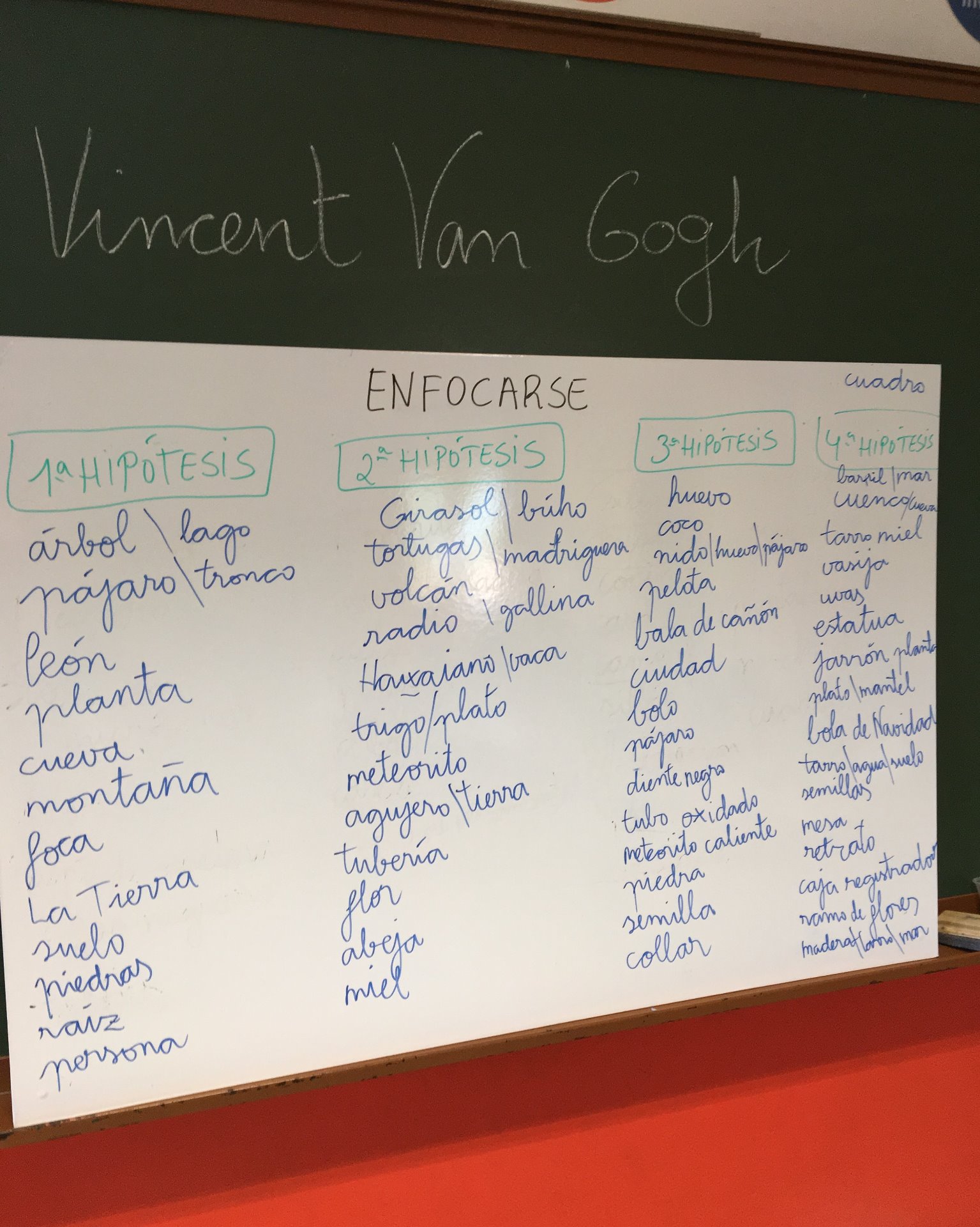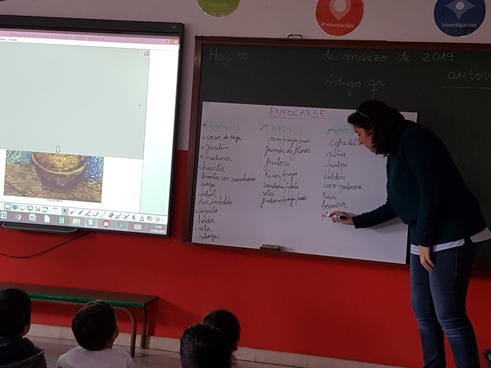 A partir de la rutina de pensamiento ENFOCARSE en la pizarra digital (PDI) tapamos uno de los cuadros del famoso pintor. Se iba descubriendo el cuadro y todo el alumnado proponía hipótesis acerca de lo que había debajo hasta descubrirlo por completo.