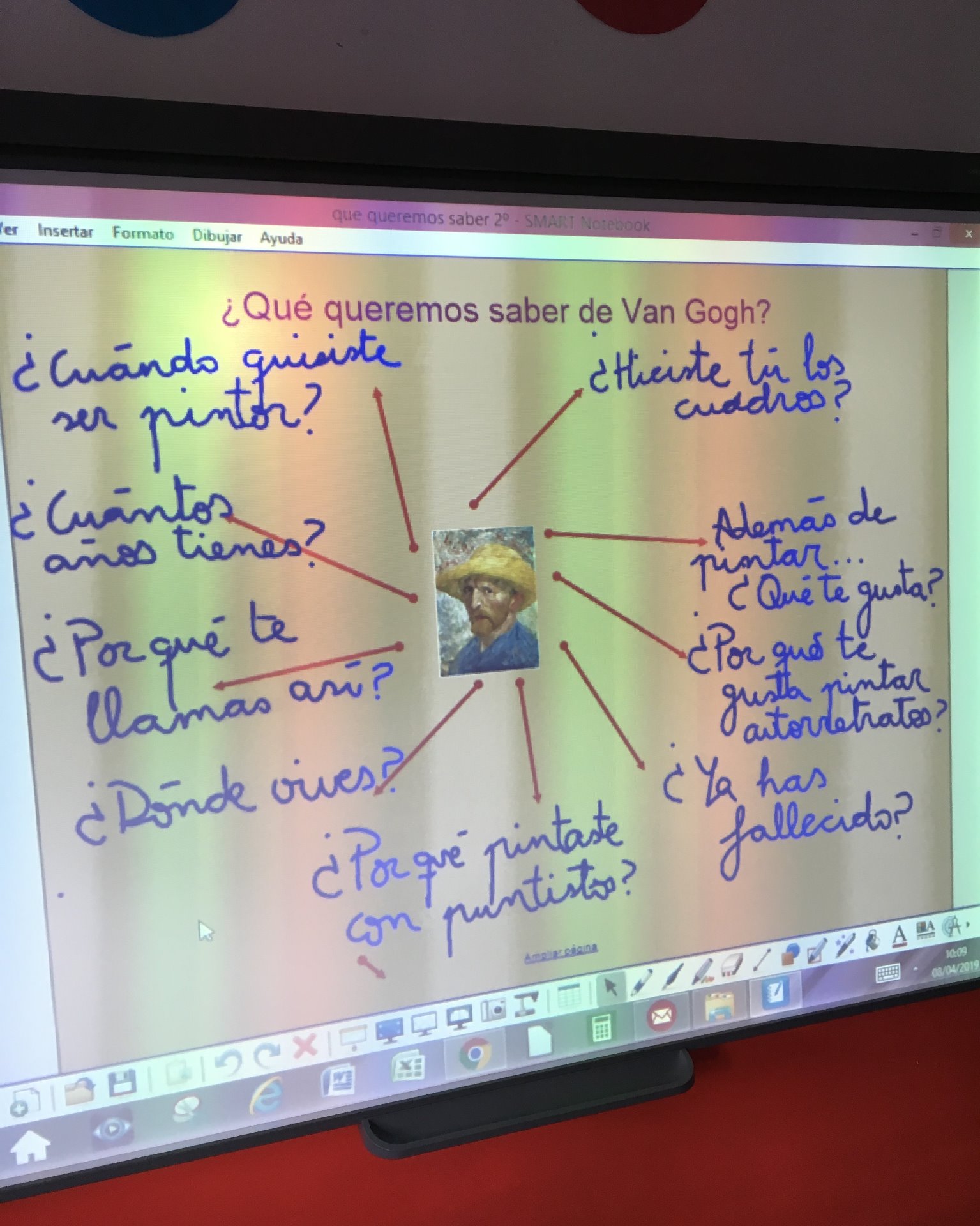 Rutina del pensamiento: ¿Qué queremos saber? En la PDI con la foto de Van Gogh en el centro hacer una lluvia de ideas de lo que queremos saber acerca de él y las vamos anotando.